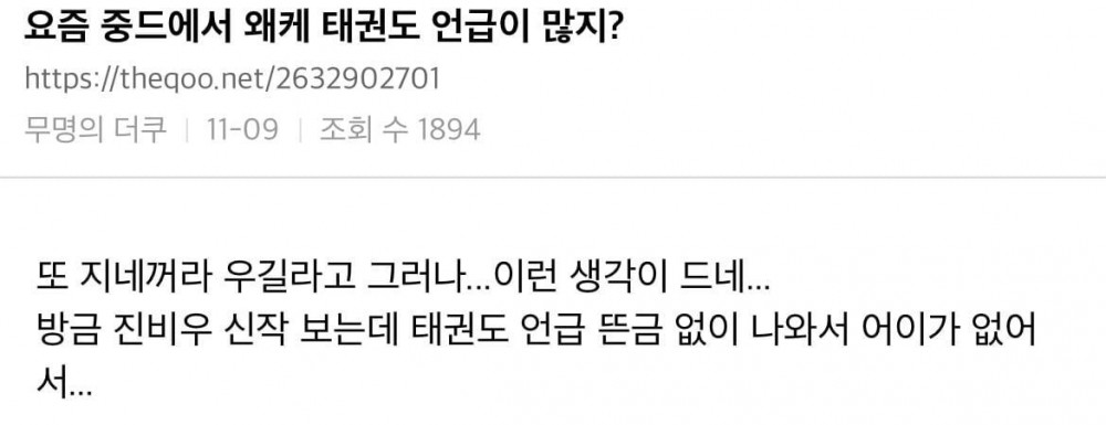 태권도의 언급 빈도가 점점 늘고 있어서 차이나방에서 거슬린다는 얘기가 나오고 있음 태권도장에 태극기가 걸려 있지 않은 걸 봐서는 국가에서 단체로 지시받고 조직적으로 넣는 것 아니냐는 얘기도 있음