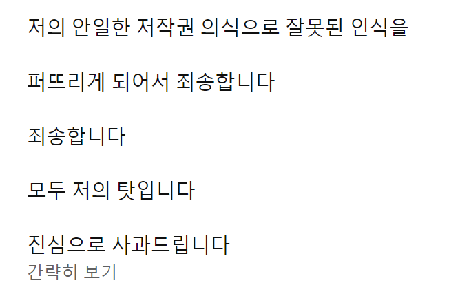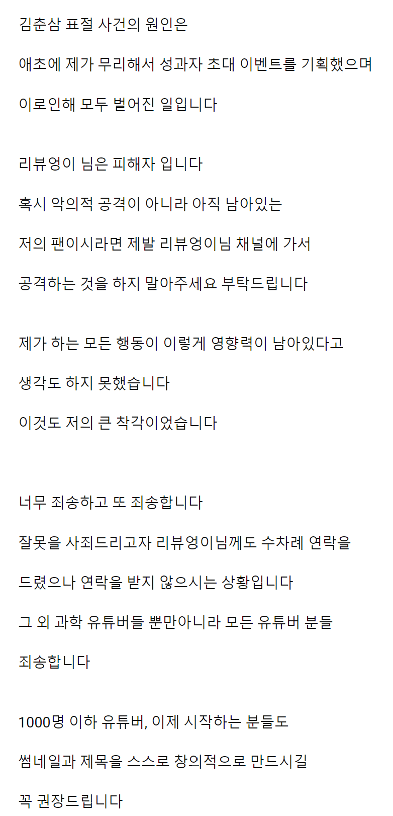 영상 다시 내리고 커뮤니티글에 사과문 올림.