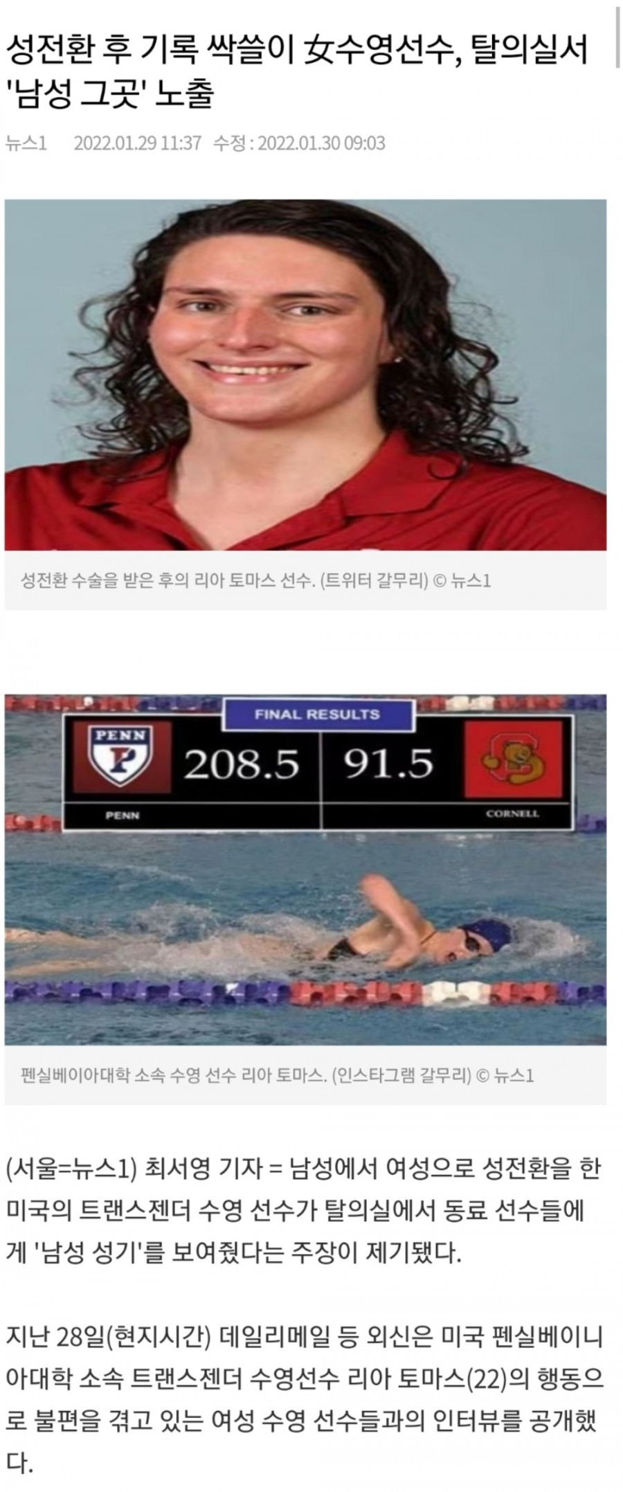 여자 수영대회에서 1등한 트랜스젠더 수영선수