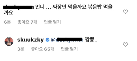 이뿐만이 아니었다. 한 팬이 "짜장면 먹을까요 볶음밥 먹을까요"라고 물었다. 수지는 보기에 없었던 "짬뽕"을 택했다. 이어 "당장 결혼해달라"는 댓글에는 "당장은 좀"이라고 답했다.