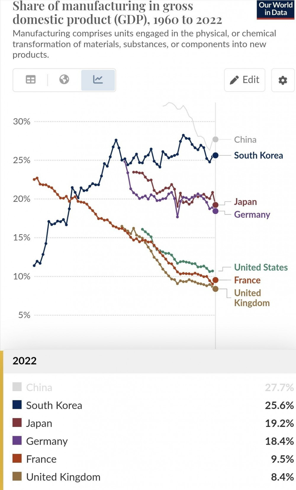 제조업은 산업혁명이 시작한 이래 가장 정석적인 국가가 자본을 축적하고 대량의 중산층을 확보하는 산업 코스였음.