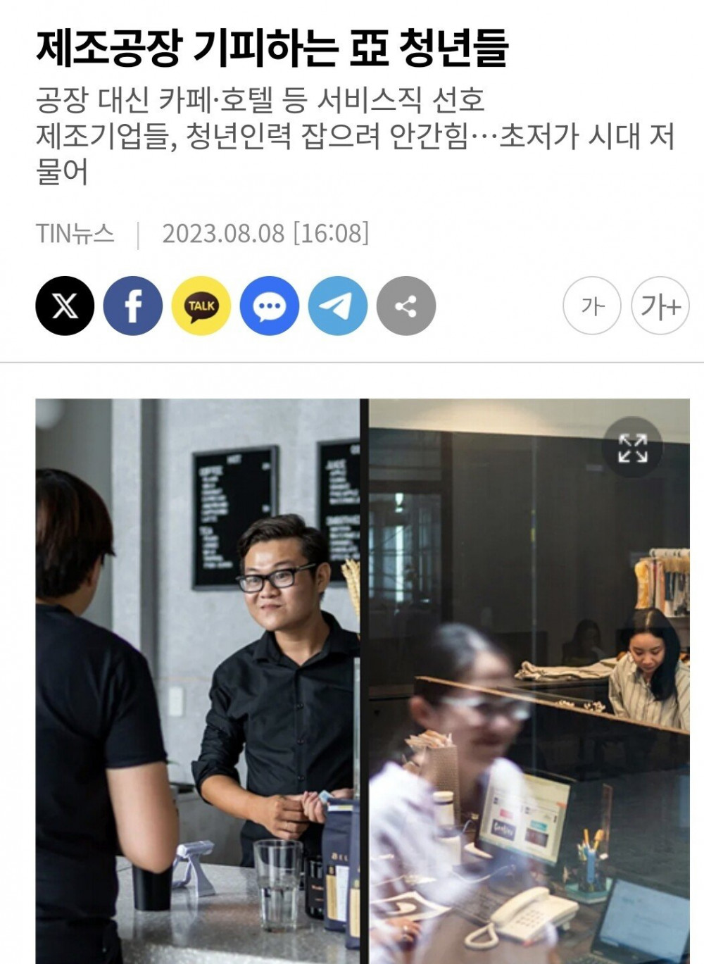 그리고 이런 국내외 정보가 자기 손 안에 있는 스마트폰으로 텍스트, 사진, 동영상으로 공유되고 있다면 젊은이들은 당연히 임금 수준도 낮고, 개도국 기준으론 나름 엘리트인 대졸로도 커리어 상승이 뻔한 제조업을 안한다는것.