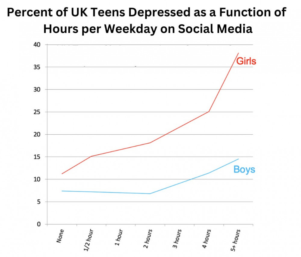 [ 소셜 미디어 사용 시간에 따른 우울증 증가 ]