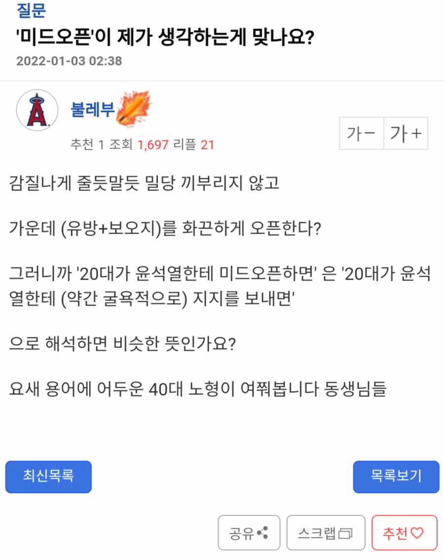 미드 오픈이 생소한 40대가 주류인 커뮤니티의 해석