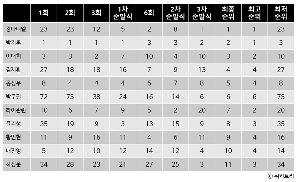 박지훈은 최저 순위 3위, 최고 순위 1위를 기록했다. 최종 순위는 2위였다. 이대휘의 최저 순위는 10위, 최고 순위는 2위였다. 최종 순위는 3위로 마무리했다. 옹성우는 최저 순위 8위, 최고 순위 4위를 찍었다. 최종 순위는 5위였다.
