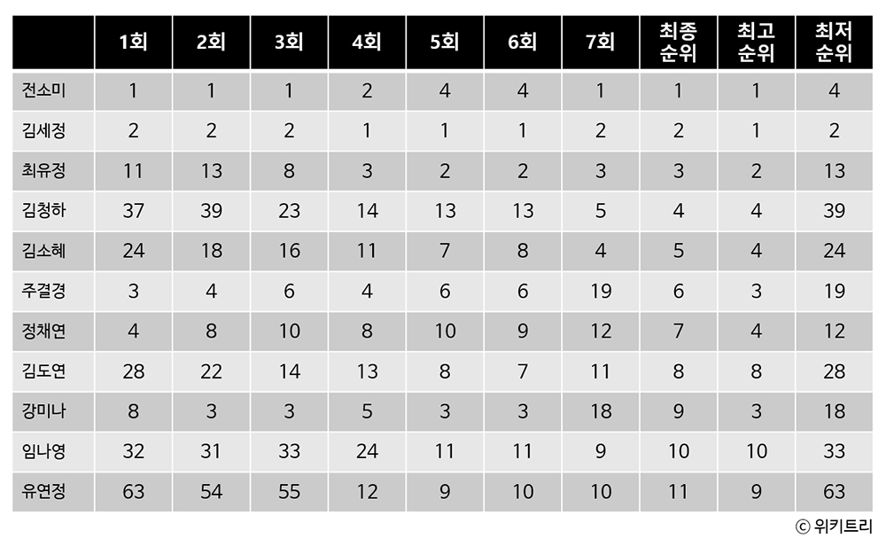 그러나 임나영과 김도연, 김소혜, 김청하, 유연정은 순위 격차가 심했다.
