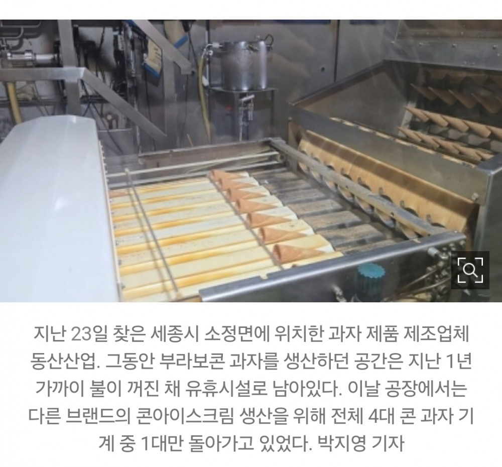 23일 오전 세종시 소정면에 있는 동산산업. 아이스크림 제품에 들어가는 과자를 만드는 전문 제조업체인 이곳에서 부라보콘 콘 과자를 만들던 공간은 불이 꺼진 채 휑했다. 1985년부터 콘 과자를 생산했던 이곳은 지난해 11월 무렵 빙그레(해태아이스크림)로부터 주문이 끊겼고, 이후 기계가 작동을 멈췄다.